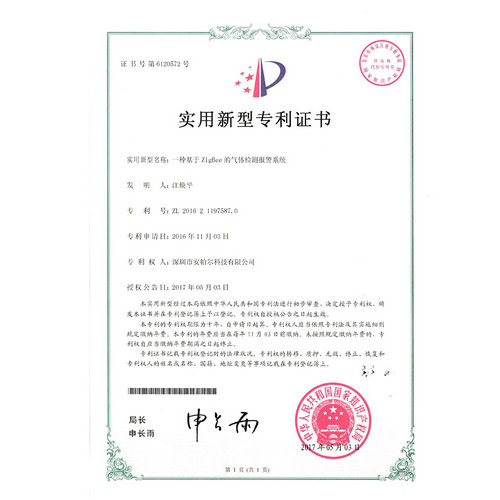 一種基于ZigBee的氣體檢測報警系統專利證書