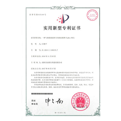 一種氣體監測系統專用的防爆型ZigBee網關專利證書
