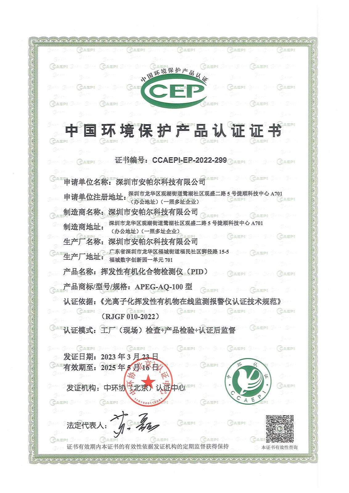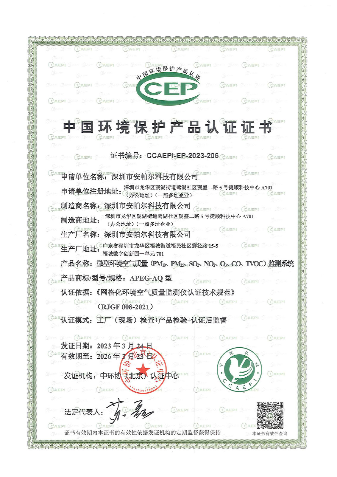 中國環境保護產品認證證書 APEG-AQ